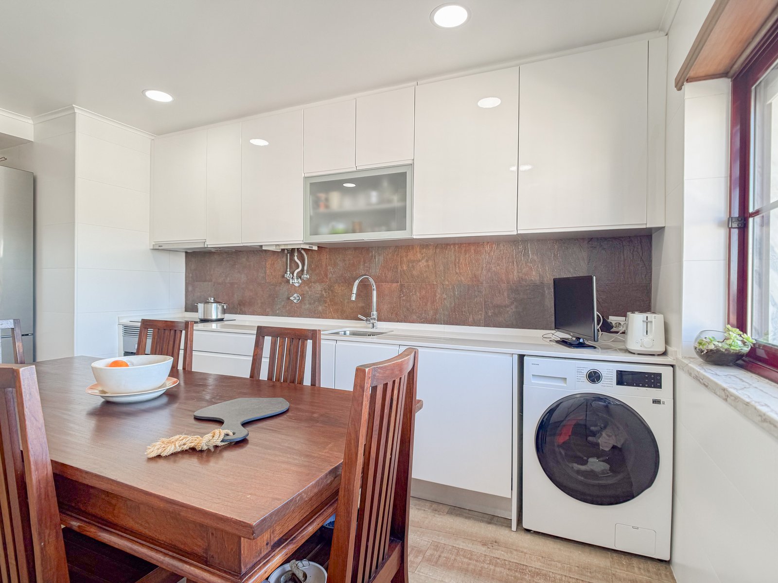 A cozinha encontra-se equipada com placa, forno, frigorífico, exaustor e máquina de lavar e secar roupa.